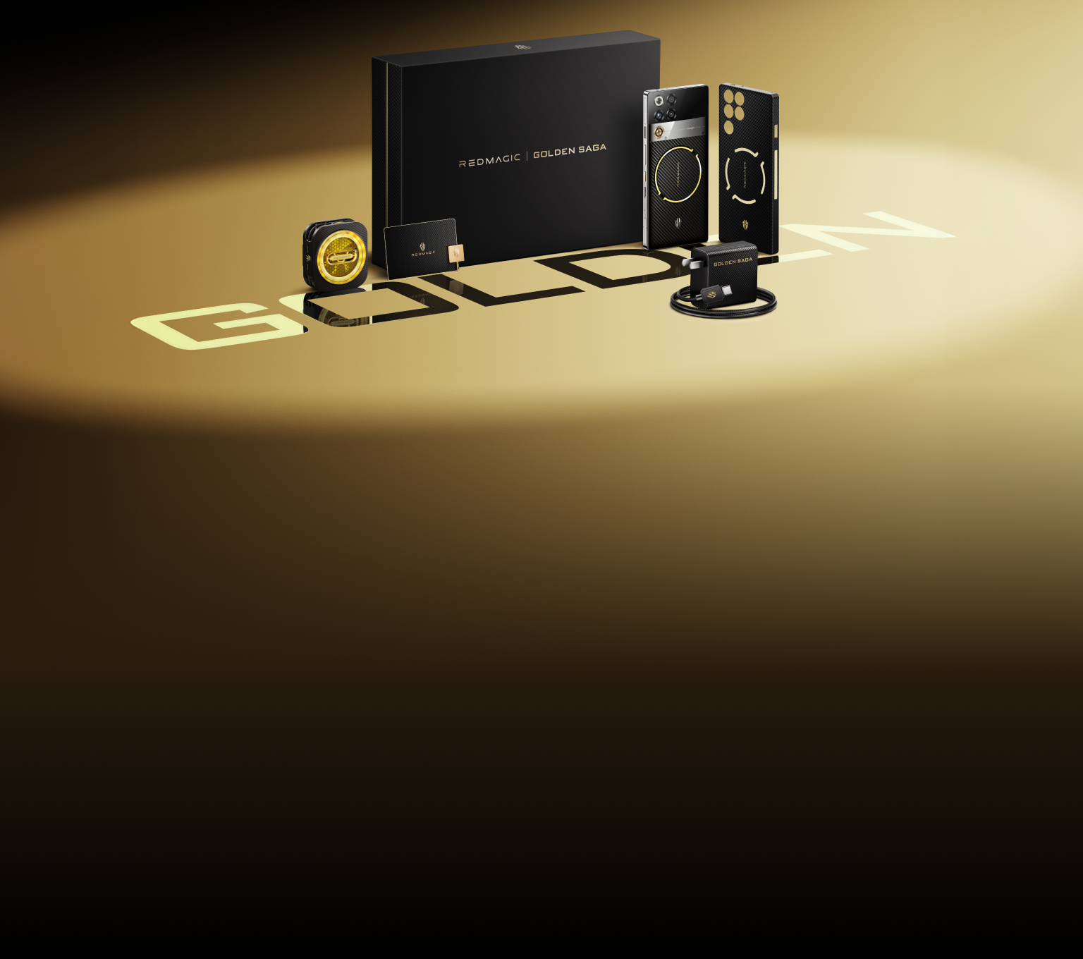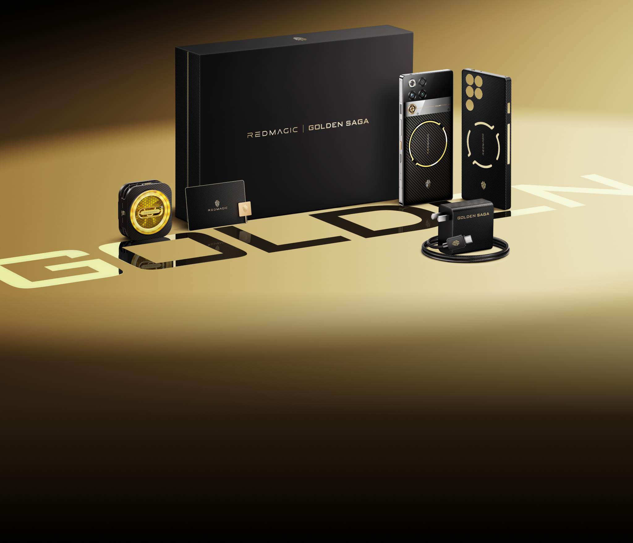 1. Chapado en oro: botón de encendido, logotipo REDMAGIC y Golden Saga, cámara de vapor, conducto de aire compuesto de oro y plata, tarjeta de coleccionista y pin de tarjeta SIM.