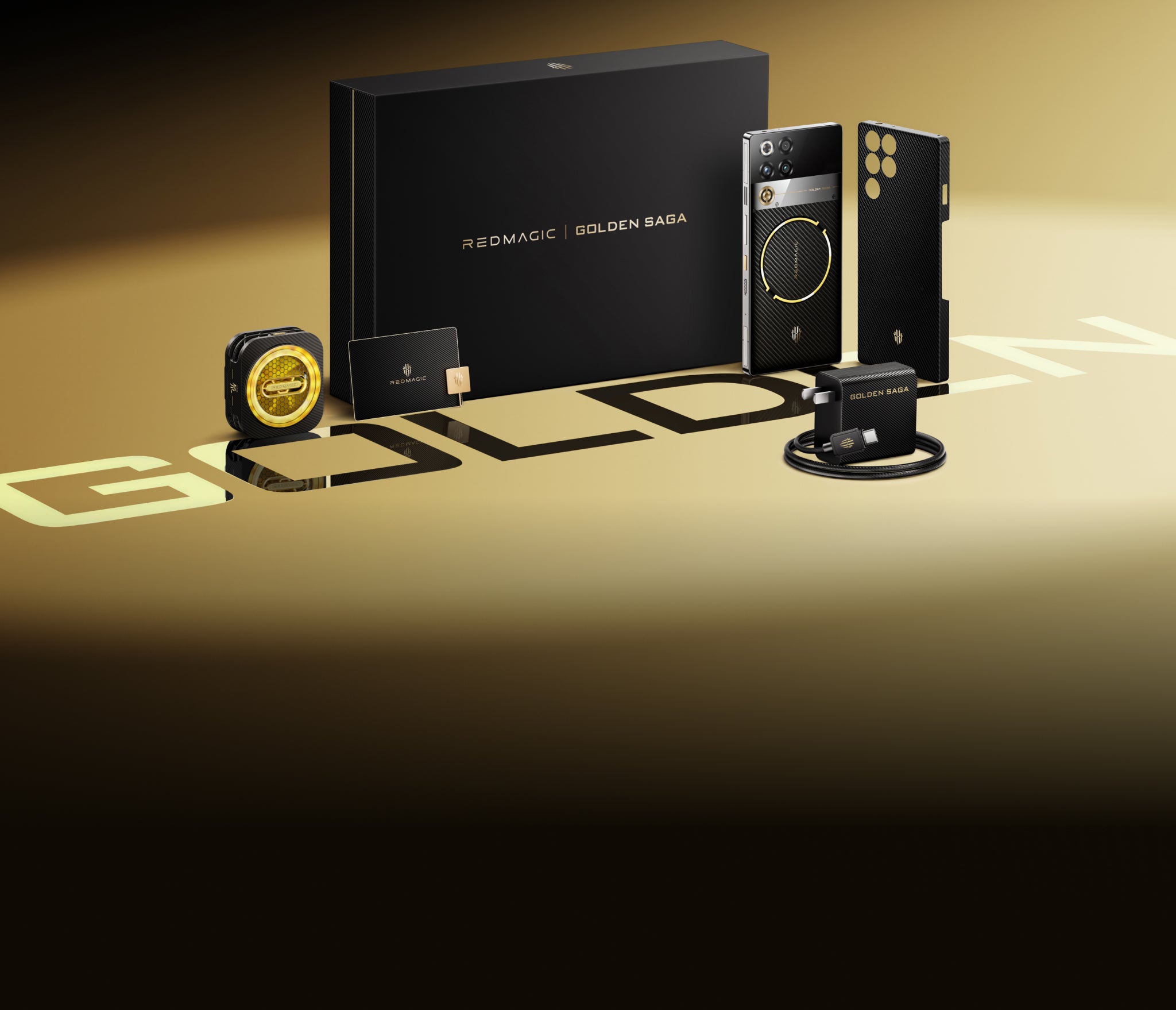 1. Chapado en oro: botón de encendido, logotipo REDMAGIC y Golden Saga, cámara de vapor, conducto de aire compuesto de oro y plata, tarjeta de coleccionista y pin de tarjeta SIM.